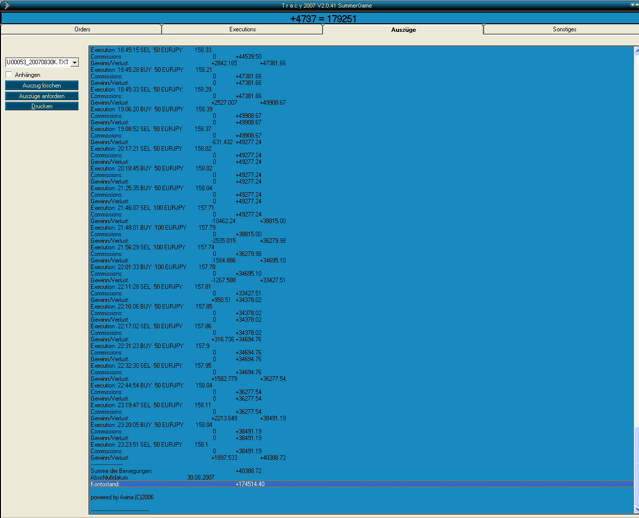 Allerdings gibt es mit dem Forex-Datenlieferant speziell im EUR/JPY-Pair ein "großes" Problem! Scalpen kann man mit der Tracy-Plattform nur per Market-Orders, da Limit-Orders einfach zu lange dauern. Der Datenlieferant weitet aber ständig des Spread in Schritten von 4P, 10P, 15P und manchmal sogar 35P aus. Wenn man da nur einen Bruchteil einer Sekunde zu spät auf den Button klickt, hat man mit einer 50-Lot-Position schnell mal einen 15.000€-Verlust an der Backe, ohne dass sich der Kurs überhaupt von der Stelle bewegt hat. Und das macht dieser Datenlieferant ständig, nicht nur bei anstehenden News! Dies erfordert eine ungemeine Konzentration. Verluste dieser Art haben mich schon bistimmt 20x in die Tischkante beißen lassen. Das regt mich noch mehr auf, als wenn real ein paar Hundert Euro verloren werden, da man eigentlich nichts falsch gemacht hat, aber trotzdem Geld verloren hat und einfach nicht weiterkommt. War heute schon wieder mehrmals der Fall. War am Kontostand von MDV bereits wieder dran. Dann kamen wieder zwei solche Verlusttrades.