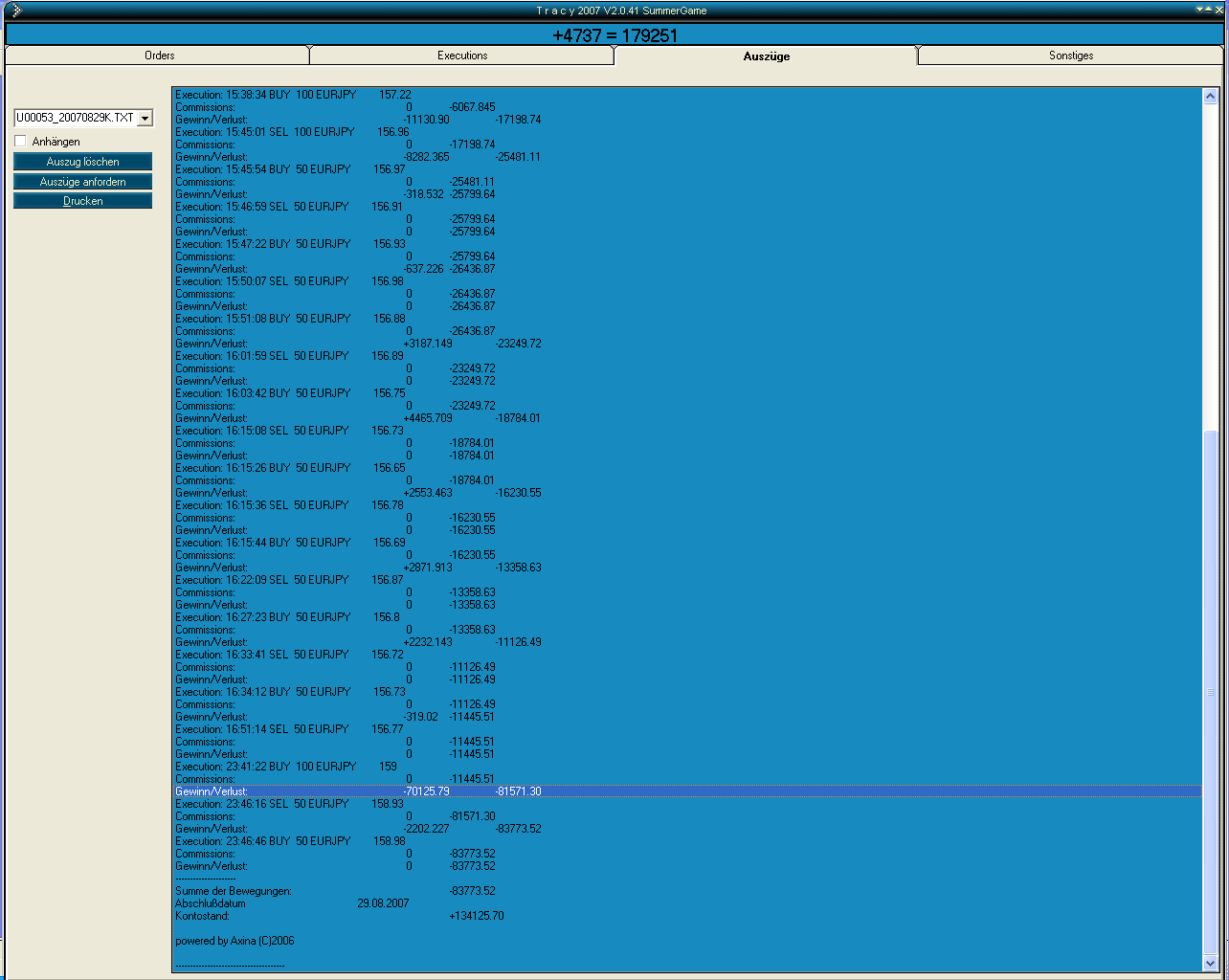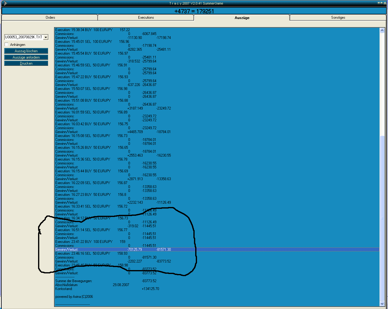 Allerdings gibt es mit dem Forex-Datenlieferant speziell im EUR/JPY-Pair ein "großes" Problem! Scalpen kann man mit der Tracy-Plattform nur per Market-Orders, da Limit-Orders einfach zu lange dauern. Der Datenlieferant weitet aber ständig des Spread in Schritten von 4P, 10P, 15P und manchmal sogar 35P aus. Wenn man da nur einen Bruchteil einer Sekunde zu spät auf den Button klickt, hat man mit einer 50-Lot-Position schnell mal einen 15.000€-Verlust an der Backe, ohne dass sich der Kurs überhaupt von der Stelle bewegt hat. Und das macht dieser Datenlieferant ständig, nicht nur bei anstehenden News! Dies erfordert eine ungemeine Konzentration. Verluste dieser Art haben mich schon bistimmt 20x in die Tischkante beißen lassen. Das regt mich noch mehr auf, als wenn real ein paar Hundert Euro verloren werden, da man eigentlich nichts falsch gemacht hat, aber trotzdem Geld verloren hat und einfach nicht weiterkommt. War heute schon wieder mehrmals der Fall. War am Kontostand von MDV bereits wieder dran. Dann kamen wieder zwei solche Verlusttrades.