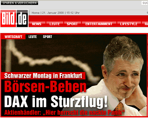 Bislang dachte ich, einen Crash kann es nur aus einer Euphorie heraus geben, die wir bislang in den USA und Europa noch nicht gesehen haben. Soweit wohl auch die Meinung der meisten - und genau da liegt der Hund begraben. Die Börse hat in der Vergangenheit vor allem eines gelehrt: Erwarte das Unerwartete. Lektion 2008: Die Baisse beginnt mit Mangel an Vertrauen und nicht wie früher mit Sorglosigkeit.