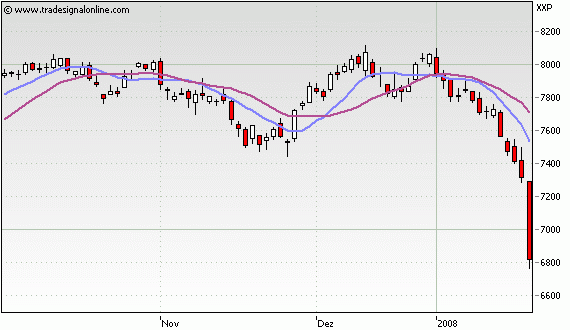 Da verabschieden sich alle, die in den letzten 5 Jahren Aktien gekauft haben - und zwar alle in 2 Wochen und einem Tag. Mal schauen, wo die Gegenbewegung einsetzt. Vielleicht schaffen wir es ja noch mal an die 200-Tagelinie bei 7500, die im Moment sehr weit entfernt scheint. Ob das Kapital, das auf lange Sicht anlegt, so schnell wieder zurückkommt, stell ich mal in Frage. Dafür ist gerade bei den Banken zu viel Porzellan (will sagen Vertrauen) zerschlagen worden. Bis dahin sind die Trader unter sich und die werden die Kurse nicht alleine wieder nach oben ziehen. Auf Jahressicht sehe ich den Dax wohl die 5400-5500 (Zwischenhochs aus 2002) ansteuern. Vielleicht sehen wir im Q1 noch gute Unternehmenszahlen, die eine Korrektur der Kurse nach oben rechtfertigen, aber dann sollte es weiter runter gehen. Denn auch wenn das Q1 noch erfolgreich läuft, so bleibt die Stimmung schlecht, Misstrauen weit verbreitet und das wird sich auf die folgenden Quartale auswirken. Die jetzt noch günstige Bewertung der Aktien relativiert sich durch weg brechende Gewinne in Folge des mangelnden Vertrauens in die wirtschaftliche Entwicklung. Dann wird es schwierig Ursache und Wirkung von einander zu trennen. Kam der Crash, wegen der Subprimekrise oder potenzierten sich die Auswirkungen der Subprimekrise erst durch den Crash? Darauf wird es wohl nie eine Antwort geben. Fakt ist: die Amerikaner haben ihr Pulver verschossen, sind jetzt schon hoch verschuldet und fallen als Konsumenten aus. Dazu kommen die Chinesen mit ihrem aufgeblähten Aktienmarkt, wo die Hausse-Euphorie in den letzten Monaten keine Grenzen kannte. Wenn die Ostasiaten erst die Schattenseiten der Börse kennen gelernt haben, werden auch sie den weg brechenden US-Konsum nicht auffangen können (selbst wenn dort die Krise keine Spuren hinterließen, könnten sie es imho nicht). Europa mit seinen noch relativ starken Gewerkschaften wird in nächster Zeit höhere Tarifabschlüsse erleben, was die Inflation nährt. Es ist einfach mehr Potential nach unten als nach oben da. Im Gegensatz zu den letzten 6 Monaten ist das den Anlegern auch bewusst geworden. Jetzt beginnt die Phase, in der Zinssenkungen und Konjunkturprogramme gegenteilig wirken. Das Schlagwort lautet nun: "Wenn die Politik solche Schritte unternimmt, dann muss es wirklich schlimm um die Wirtschaft stehen".