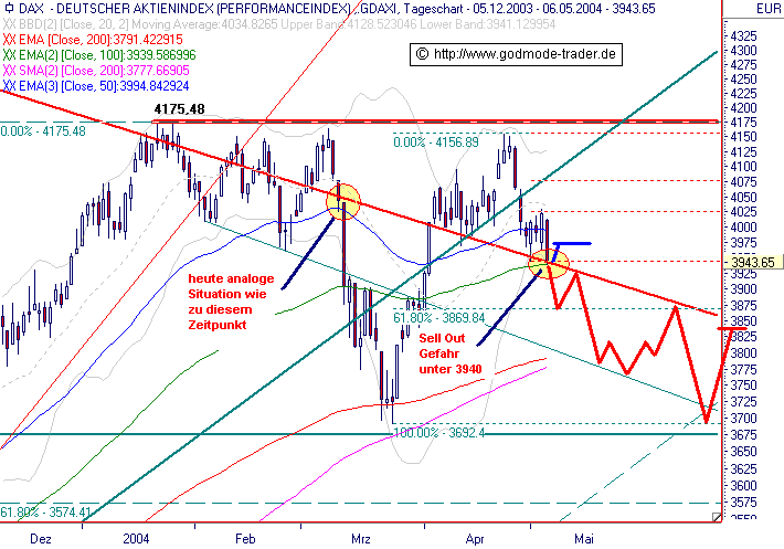 Kurz-Kommentierung: Das DAX Ziel 3945 wurde erreicht. Prinzipiell ist das Level 3946-3938 "betonhart" im Sinne einer starken Unterstützung, wie der Tageschart verrät. Jedoch sollten in den US Indizes und im Eurostoxx50 noch tiefere Ziele angesteuert werden. Dies bringt die worst case Variante für den Dax ins Spiel. Denn fällt der Dax bei hohem Momentum unter den Support 3946-3938 zurück, sind Sell Out Ziele bei 3875 und schließlich 3777-3791 (2mal 200er GLDer)erreichbar. Eine fast analoge Situation fanden wir am 11.03.2004 vor. Die Situation vom 11.03.04 und von heute wurden im Chart gelb markiert.