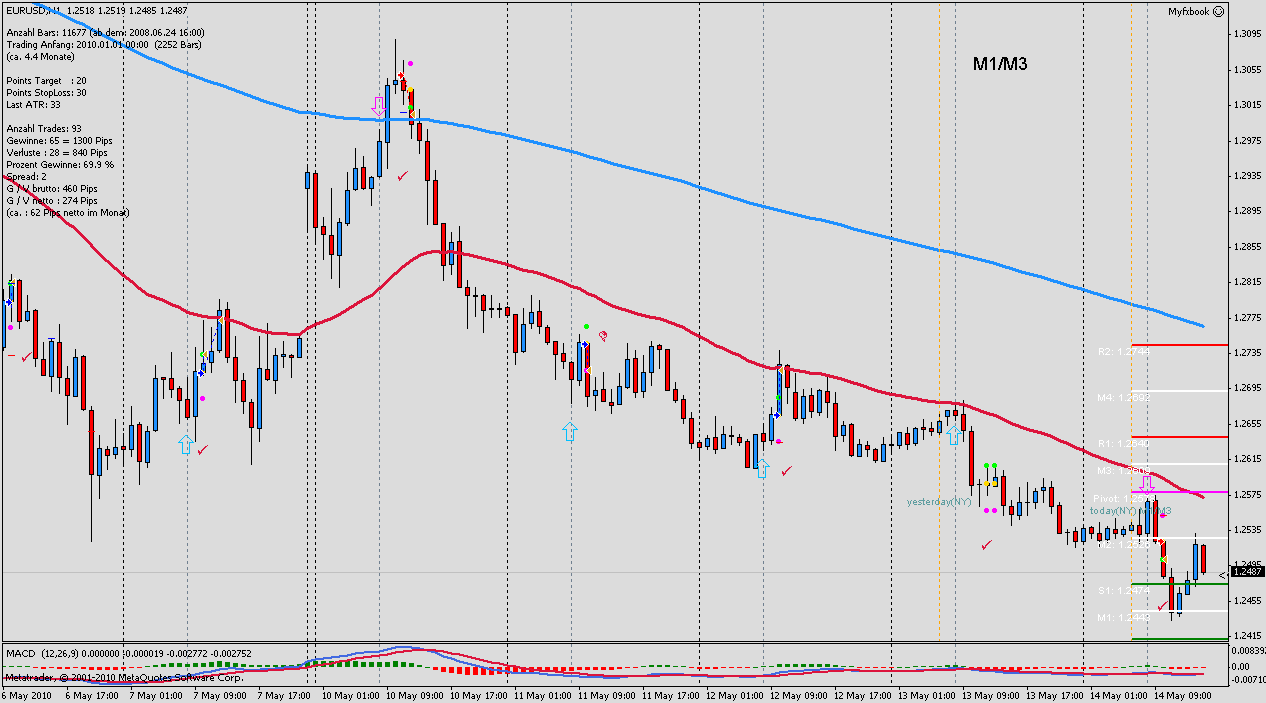 Ich habe die Peganuss Strategie weitervervolgt und möchte gerne die zusamenfassung seit dem Letzten Trade hier veröffentlichen der im Viedeo am 14.05.2010 war. Seit dem Tag gab es 38 Trades davon waren 9 Verlierer und 29 Trades waren Gewinner bei Max 5 Verlieren in Folge aber 18 Gewinnern in Folge. Wenn man Propunkt einen € berechnet wären es gesamt ingesamt Brutto 310 € übrig geblieben nach Kosten von einem Punkt wären es Netto um die 270€ gewesen was eindeutig ein guter wert ist.