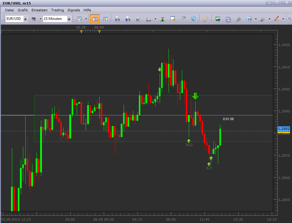 Trade#9 wieder im EUR/USD Short kam aufgrund einer Formation im 15er zustande. Das 1 Lot hatte einen I-Stopp von -15 Pips. Die Position wurde an den Rangegrenzen im 2h Chart glattgestellt.