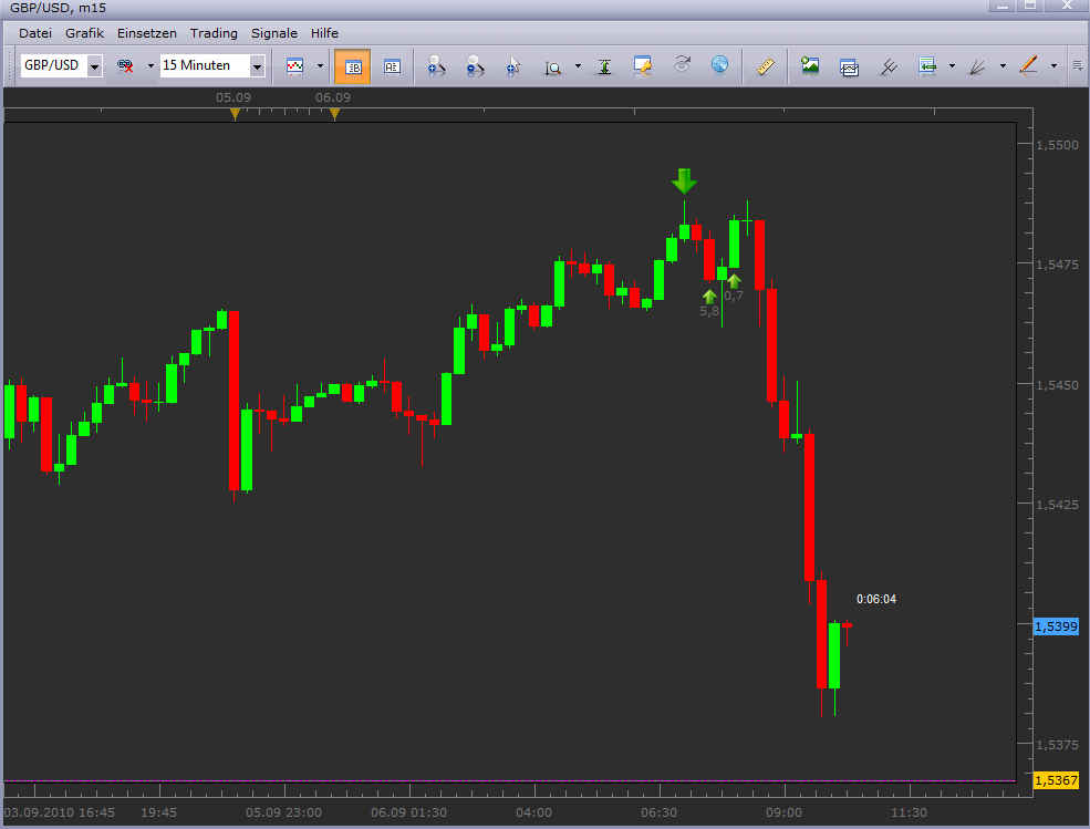 Trade#4 war der Versuch die Trading-Range im 15er nach unten zu handeln. Ich eröffnete die Position mit 3 Lots und einem I-Stopp von 10 Pips. In meiner vorangegangenen Analyse erkannte ich schon die Möglichkeit einer Formation für den Ausbruch aus dieser Range nach oben. Mein Shortrade kam nur kurzzeitig in den Gewinn, und mit der Eröffnung der nächsten Periode stand auch die Formation fest. Ich schloß die Shortposition. Mit Eröffnung der nächsten Periode und dem überschreiten des Hochs war die Formation bestätigt. Daraus entstand: