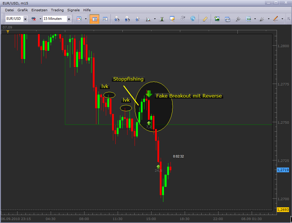 Trade#12 im EUR/USD war die Umsetzung einer Low-Risk Idee. Gerade wenn die Märkte starkes Momentum aufgebaut haben und man kommt nicht wirklich günstig in den Markt rein ist es oft eine Frage der Geduld. Ich versuche zu warten bis die großen Jungs wieder bereit sind drauf zu drücken. Also brauche ich eine Situation wo erst mal im Orderbuch naß durchgewischt wurde! Die Bären werden kurzzeitig aus dem Markt gedrückt, und die Stopps gefischt. Hier ergibt sich dann eine Formation die sehr beliebt und effektiv ist. Der Fake-Breakout aus einer Range und dann die echte Reaktion in die andere (die richtige) Richtung. Dieses Setup habe ich mit 1 Lot und einem I-Stopp von -10 Pips gehandelt. Die erste Hälfte habe ich am unteren Ende der Range glattgestellt um dann BE zu gehen. Die Restposi erreichte dann zügig mein Gewinnziel.