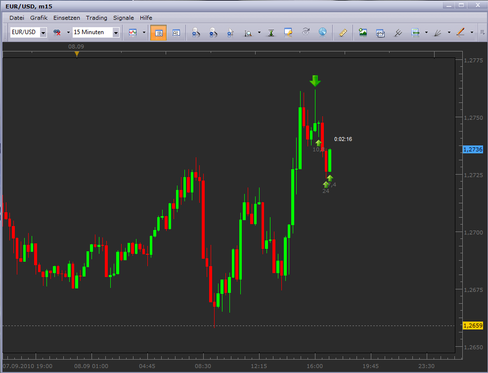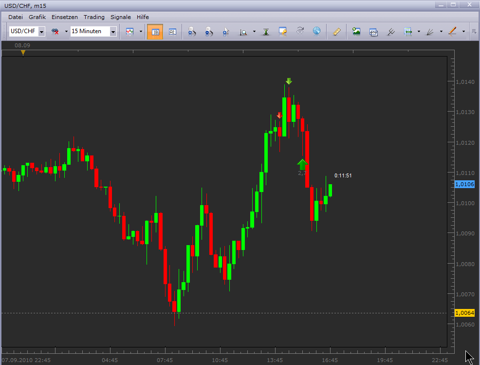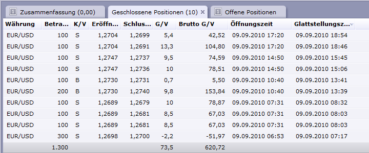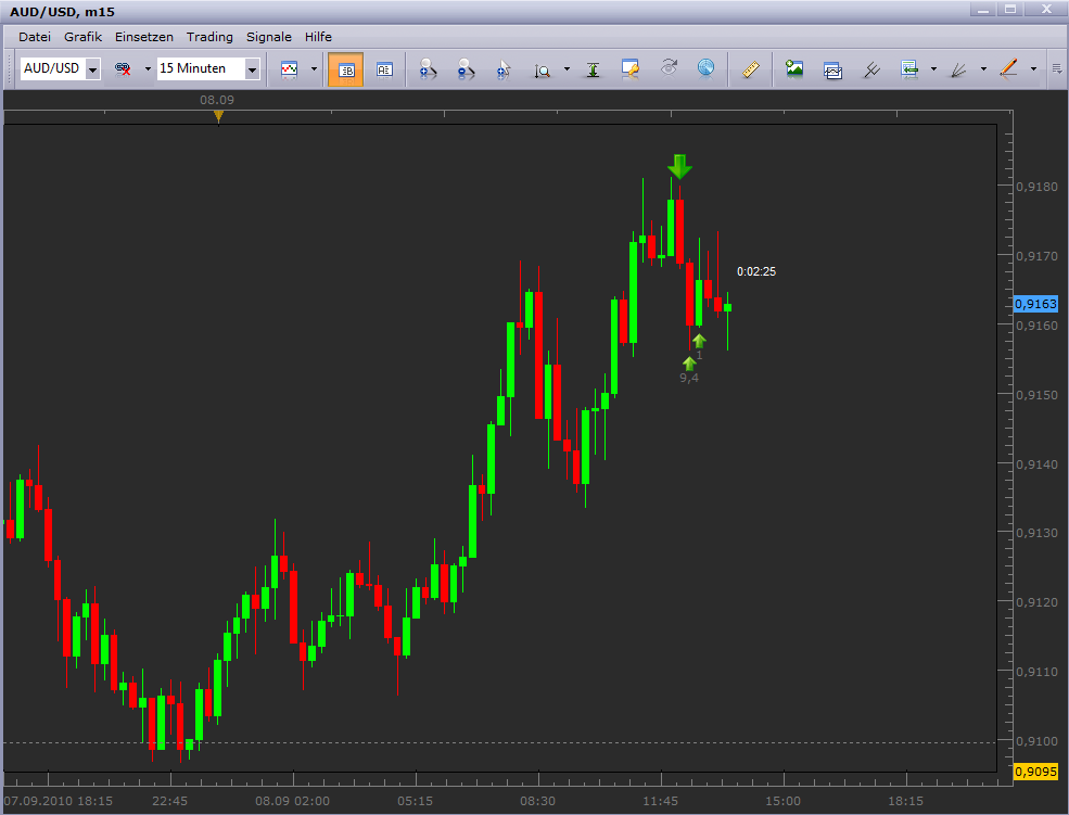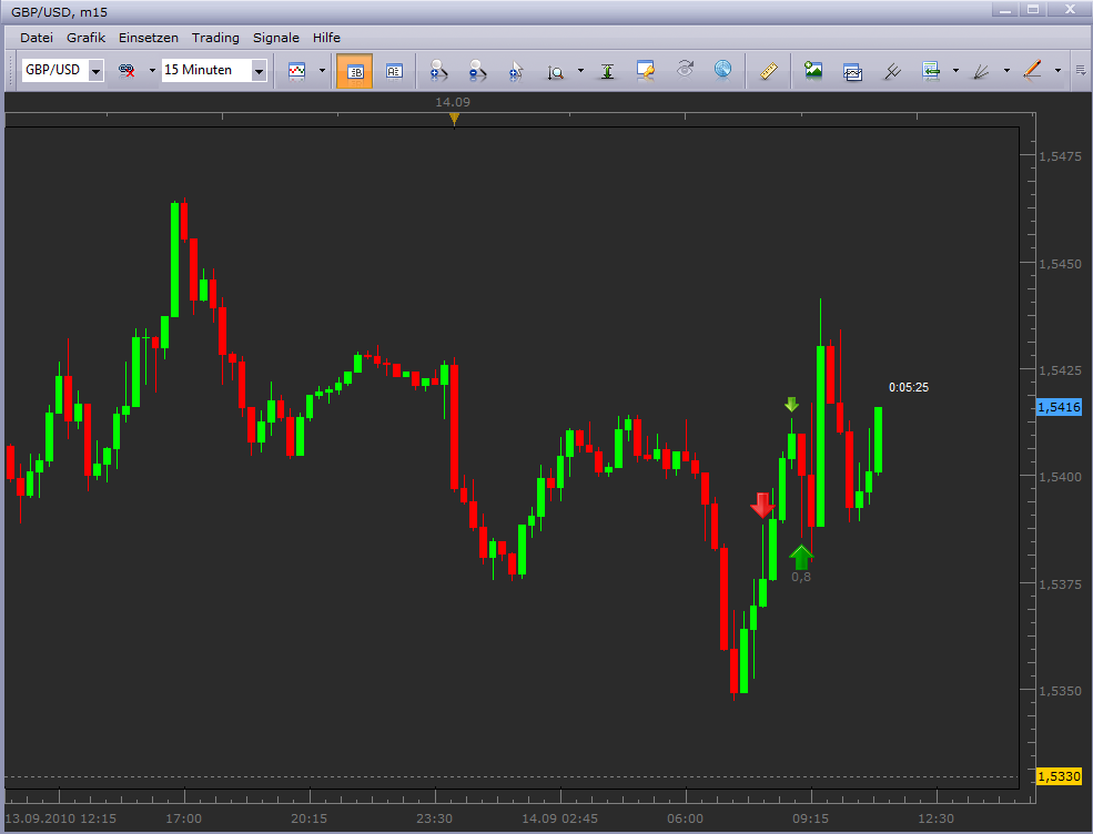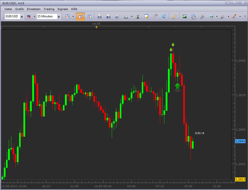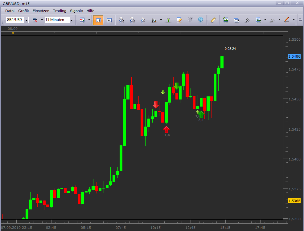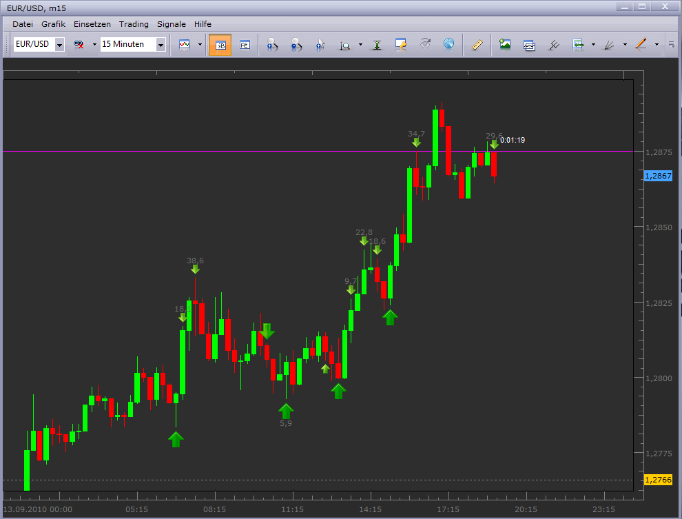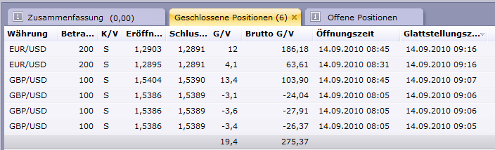 ) Entscheidend ist für mich hier aber immer die Information der Folgeperioden (Open/Close). Mit der Periode#4 setzte das erwartete Momentum nach oben ein, und ich ging nochmal mit 2 Lots und einem I-Stopp von -20 Pips Long. Die 5 Folgeperioden ermöglichten es mir die Positionen mit Gewinn aufzulösen.