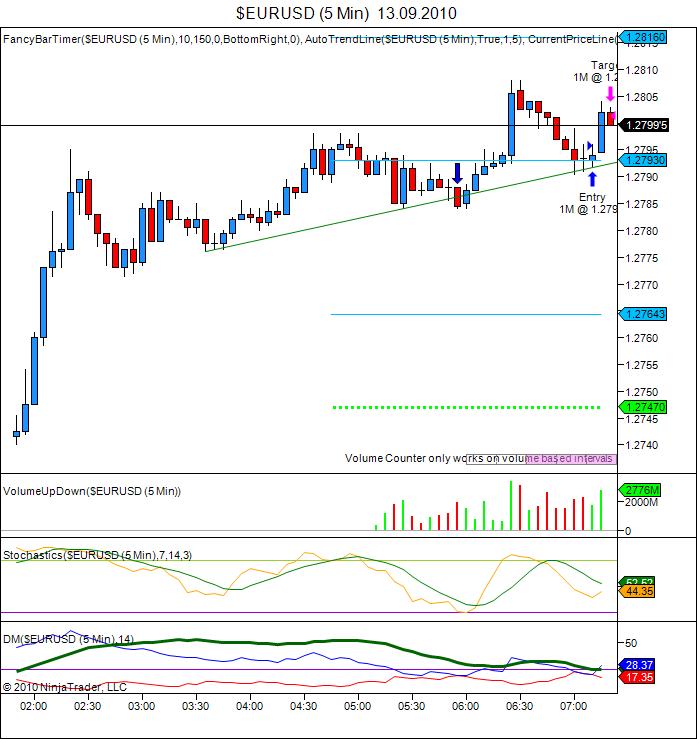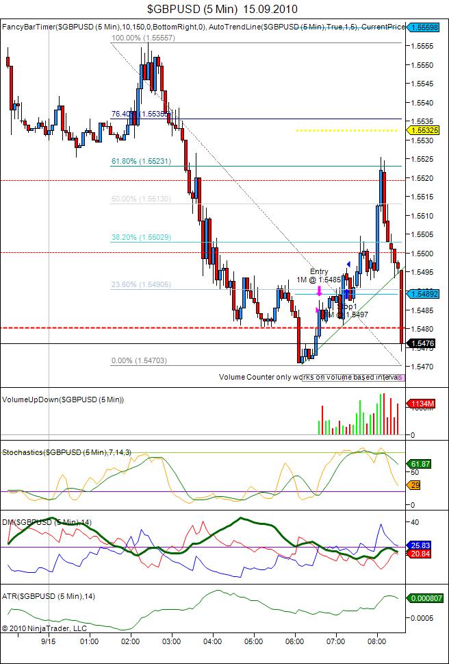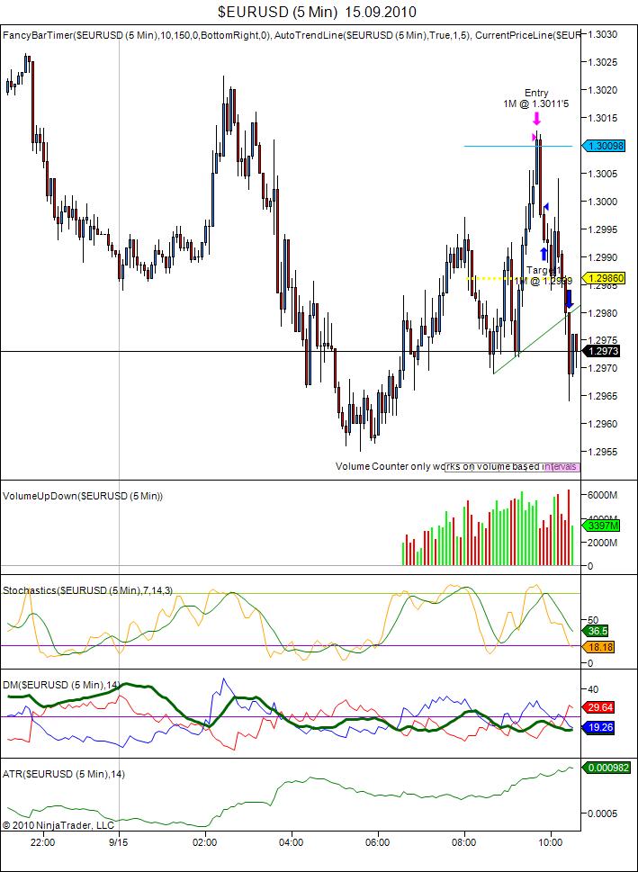Hier gab es auch wieder den Versuch in den Trend einzusteigen. Der Kurs ging kurz darauf in die gewünschte Richtung doch es schnappte schnell die Angst zu, den Gewinn wieder zu verlieren. Verstärkt wurde diese Angst aber durch das reine Gefühl dass es nicht weiter nach oben geht und die Uhrzeit. Um 7 - 9 Uhr habe ich immer die Angst, dass die Big-Player in den Markt gehen und ich gnadenlos ausgestopt werde weil die Moves dann einiges grösser werden können.