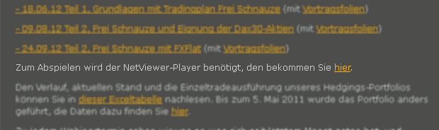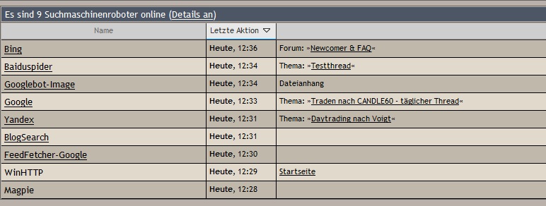 Für alle Anfänger, mir ist aufgefallen, das es in dem Bereich, in dem die Suchmaschinen Unterwegs sind, die genialsten Dinge im Forum auftauchen. Durch die Suchmaschinen, habe ich wirklich sehr interessante Threads in diesem Forum gefunden. Die Suchmaschinen schlagen bei weitem die Threads, in denen sich die User aufhalten.
