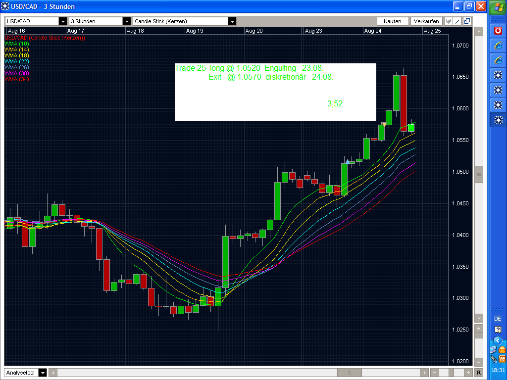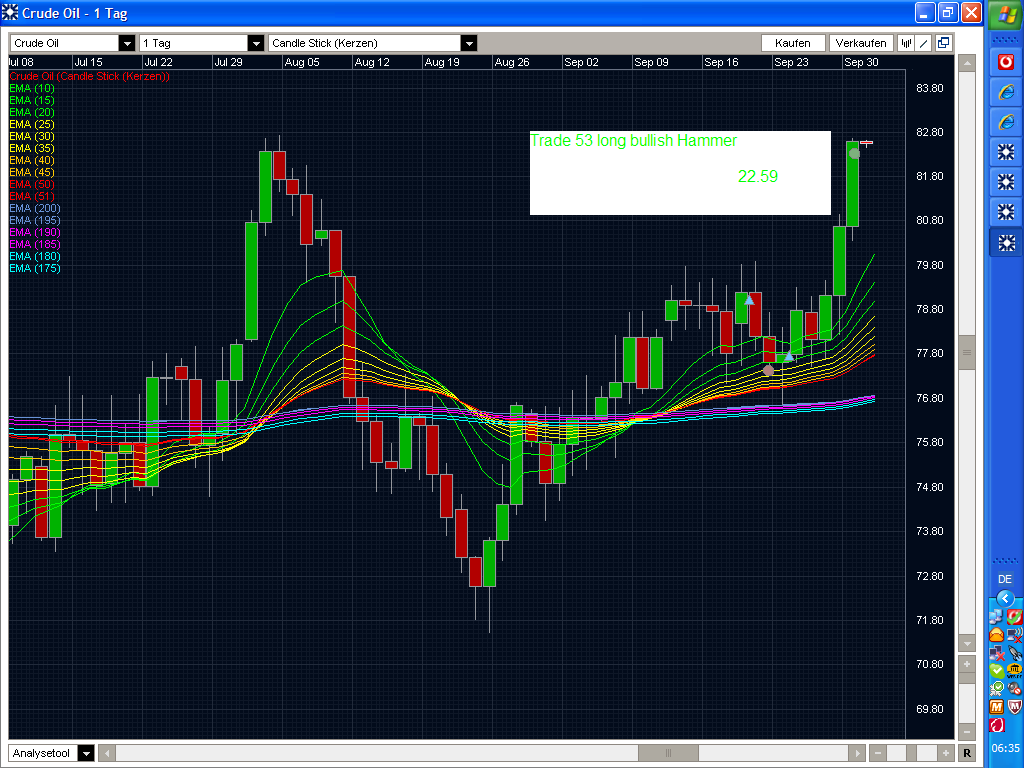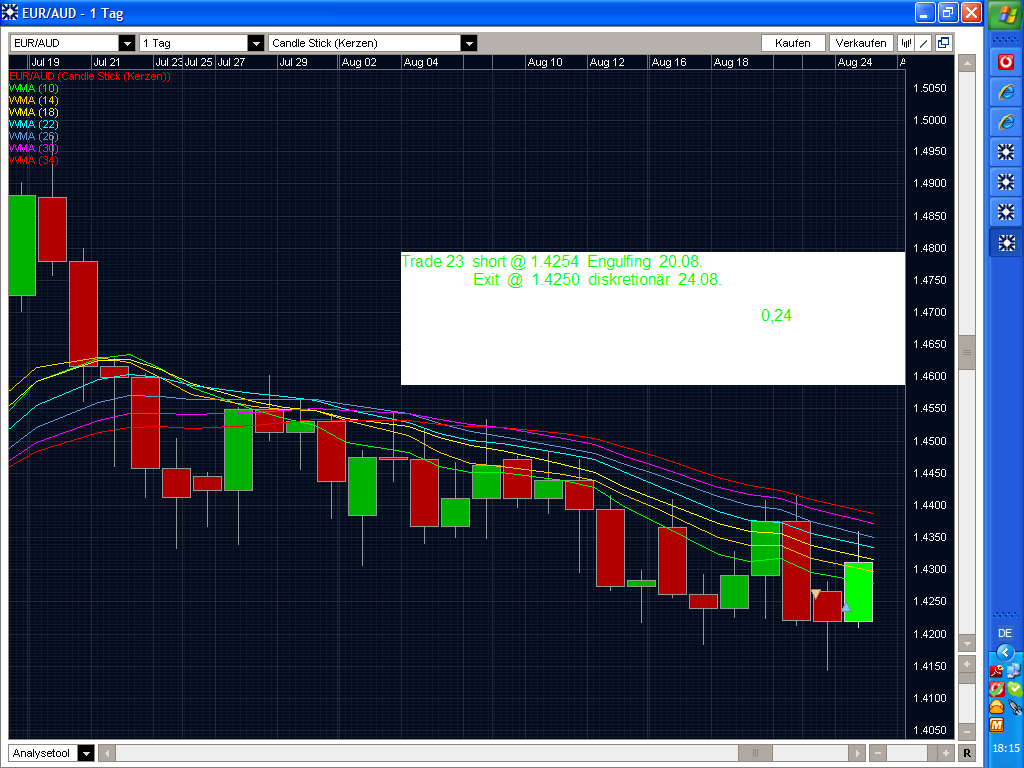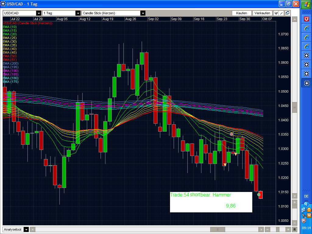 Meine Vorgänger haben ja schon etwas geschrieben. Bei Lars Gottwik kann man genaueres lesen . Der Rainbow ist ein 100%iger Trendfolger. Es werden EMAs eingezeichnet, die durch ihre farbige Darstellung den Rainbow ergeben. Nun handelt man nach Setups ( bear./bullish Hammer oder Engulfing - vom Autor empfohlen - ) in Trendrichtung. Die Setups sind aber ein wenig modifiziert und entsprechen nicht den klassischen Hammern u. Engulfings. Ich trade z.Z. im Day, man kann natürlich auch andere TFs nutzen. Der Rainbow stellt eigentlich nur das Gerüst dar. Man kann u. sollte hier auch diskretionär traden. Deshalb eigentlich auch mein Interesse an Erfahrungen. Füge mal einige Trades an. Nochmal: Hammer u. Engulfing sind rainbowmodifiziert.