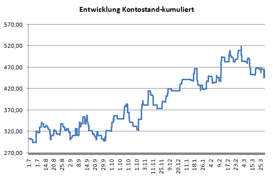 100 Trades sind sicher noch nicht endgültig aussagekräftig, aber die Performance seit einem halben Jahr zeigt einen guten Einstieg in das System. Wenn Interesse besteht, einfach mal ST-Trader anklicken,efem Journal. Hoffe, jetzt gibts nicht wieder Ärger, möchte aber einfach mehr Austausch zum Rainbow. LG efemGib nie nie nie auf H.Ford -