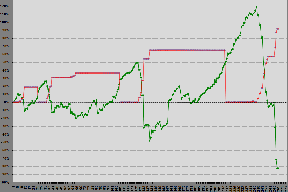 @XXX, max DD, wie ich ihn begrifflich kenne, ist der max Verlust einer Verlustserie. Profitfaktor wäre ja Gross Profit/Gross Loss. Gesamtverlust ist aber nicht max. DD. Unten siehst du ein Bsp Schaubild von der Handelshistorie eines Aboverkäufers, die ich mal erstellte, da er es nicht tat. Eine der zwei Kurven stellt den max Drawdown dar. Welche das ist, sollte allein anhand der Farbgebung klar sein. Nebenbei, wenn dir jemand, z.B. ein Signalanbieter, etwas von Super-TQ und Megaperformance erzählt, würde ich ihn auch gleich mal fragen, ob er dir auch etwas über Sortino erzählen könne. Wenn er dich fragt, ob das ein Knabbergebäck Hersteller aus Italien sei, dann ist wahrscheinlich eh alles zu spät. Sortino Ratio gibt dir Auskunft, wie risikohaft eine Performance zustande kam. Im Gegensatz zum Sharpe Ratio schaut es sich nur die Downside Deviation (Volatilität bei Abwärtbewegungen) an. Je höher SR, um so besser. Man kann es auch zusätzlich mit dem Sharpe Ratio abgleichen. Sharpe Ratios von 1.5 bis 2 sind schon sehr gut, erst recht, wenn es über mehrere Jahre anhält. Wenn das Sortino Ratio kleiner als das Sharpe Ratio ist, wäre das schon ein besserer Hinweis als nur Sharpe allein betrachtet. Jemand mit bspw. Sharpe von 2 und Sortino 5 wäre schon recht gut.