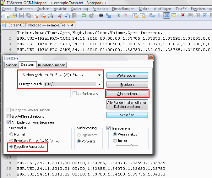 Wer kennt es nicht "Wie kann ich am Besten ein Komma durch ein Semikolon oder durch ein Leerzeichen für alle Zeilen auf einmal ersetzen?" oder "Wie kann ich den selben Namen in allen Zeilen auf einmal ändern?". Mit Notepad++ nichts leichter als das.