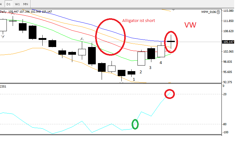 Nochmal zurück zur Frage, ob VW ein Shortkandidat wäre. Dann hätte ich jetzt eine Idee um das Signal noch weiter zu filtern - weil bis jetzt haben wir ja nur (wenn ich das richtig mitverfolgt habe) die Forderung nach einer kleinen bärischen Kerze Kerze, deren TT nicht unter den TT der letzten (und vorletzten kerze) sein darf. Es fehlt ja noch die Idee, wie ich a) den Trend und b) die Kerzen davor abzähle.