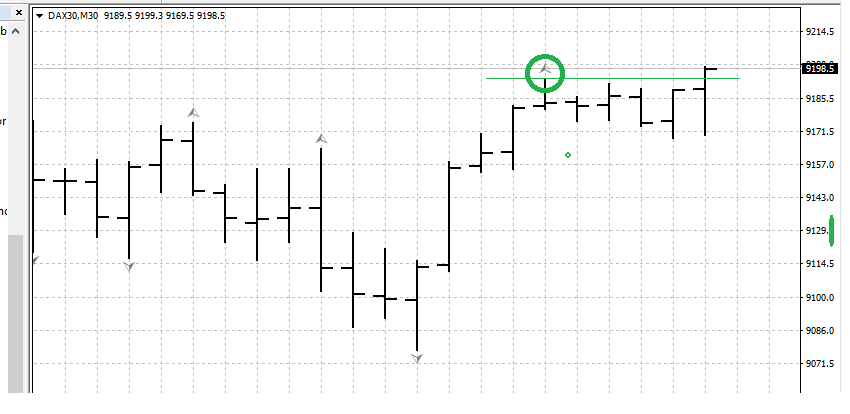 4. der Trigger, also das Tagestief nicht zu weit vom Extrempunkt der Bewegung entfernt ist. Das wäre im Falle von Shortsignalen das jüngste Hoch.