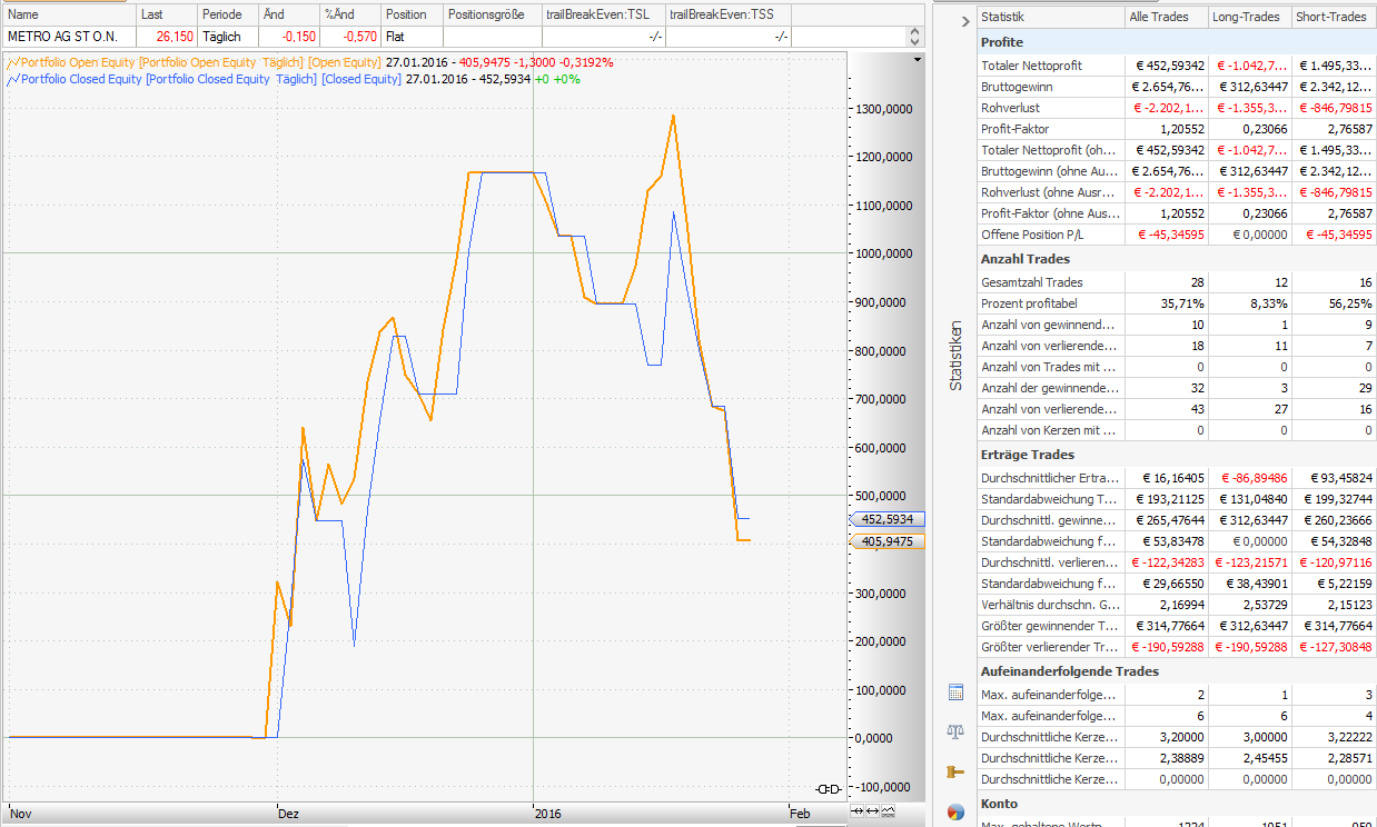 Kurzfazit: Januar ist Scheiße, die Longs der letzten beiden Monate waren Scheiße. Im Dezember noch fast 12% Profit gemacht, seit Jahresbeginn geht es abwärts. Auch wegen dem Missgeschick mit BMW und Dt. Bank mit deren profitablen Signalen vom 30.12. Das MT5-Script hat mir wegen den großen Gaps am 4. Januar die Trades ja nicht ausgelöst, die beide ins Kursziel gelaufen wären. Somit sind 6% Profit ins Wasser gefallen, die sind natürlich nicht in der Historie, weil ich das Script da auch schon am Hauptkonto laufen hatte.