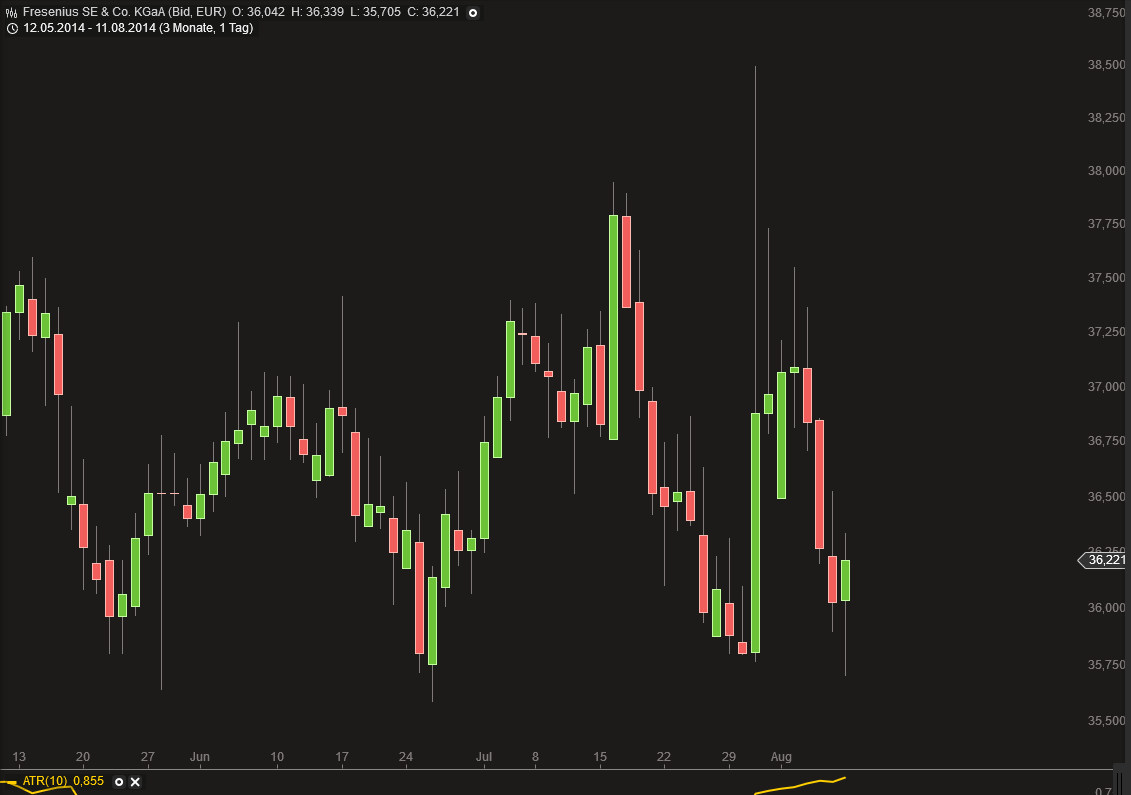 Ich probiere morgen einen Rangetrade, denn Fresenius hat mittlerweile einen Dreifach-Boden und ich habe mich die letzten Male, sowohl oben, als auch unten im Swing, geärgert, dass ich nicht eingestiegen bin, weil übergeordnet eine Seitwärtsphase läuft und das ja nicht hierher passt. Für mich ist der Chart aber die perfekte Dynamik und eine schöne Chance, auf den eventuellen Long-Zug billig mit aufzuspringen.