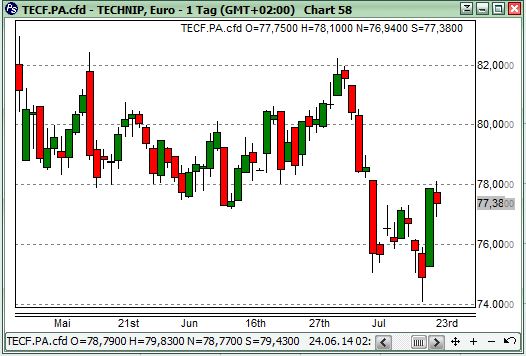 Technip: Höheres Hoch als das letzte (eventuelle Trendumkehr??), aber auch tieferes Tief. Nicht schlecht. Der Widerstand (ehemalige Unterstützung bei 77-78) sagt mir auch zu. Wohl der "beste" Chart dieser drei.Uwe 5000 schrieb: