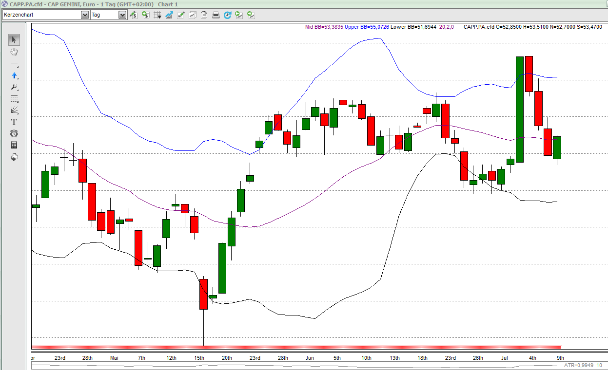 Mal zurücklehnen angesagt heute, alles schon zu weit gelaufen für einen Neueinstieg. Gibt jetzt eine ganze Handvoll Titel, bei denen ich mich auf die nächste kleine bullische Tageskerze freue. Wie Cap Gemini, oder Solvay.Der Autor ist in den besprochenen Werten zumeist selbst investiert. Traden auf eigene Gefahr, Signale sind aktuell großteils experimentell zwecks Challenge "In 30 Tagen zur Trading Strategie".