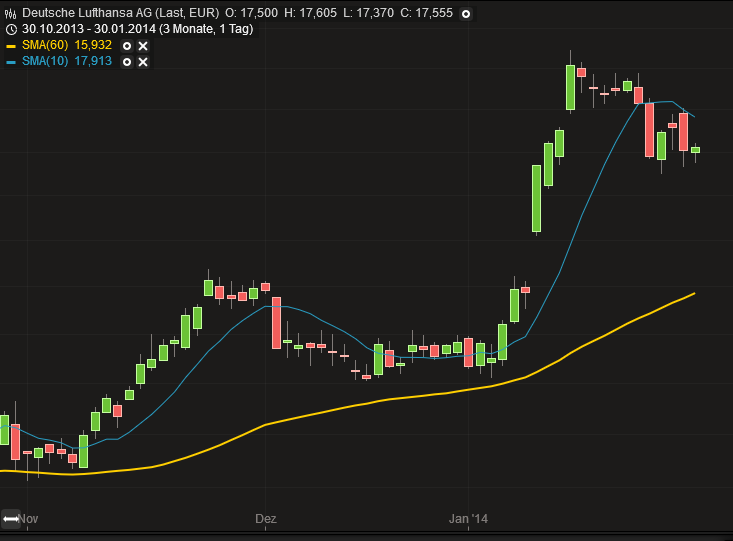 Lufthansa gefällt mir nicht, da es sich eher um eine Seitwärtsbewegung handelt, der Kurs stieg zwar sehr rasch Anfang Jänner an, aber jetzt verharrt er in einer Range. Die Korrektur hätte viel zügiger und dynamischer erfolgen müssen.