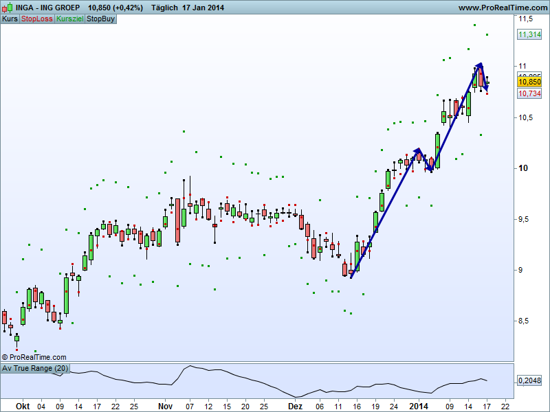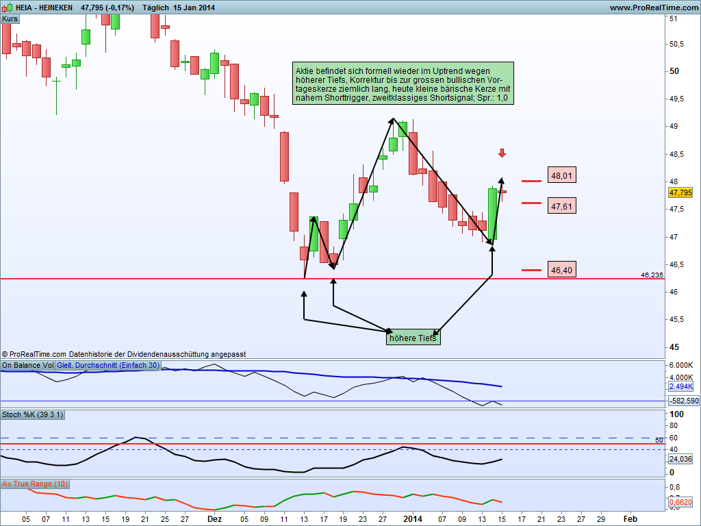 Für meinen Teil lasse ich Adidas aber auch links liegen, weil für mich immer noch ein intakter Aufwärtstrend besteht. Der Chart hat wunderbare Aufwärtsswings. Noch besser sieht man den Trend, wenn man in den Wochenchart schaltet. Ich werde morgen mit Heineken ins Rennen gehen. Die sind nah meiner Einschätzung wirklich im Abwärtstrend.