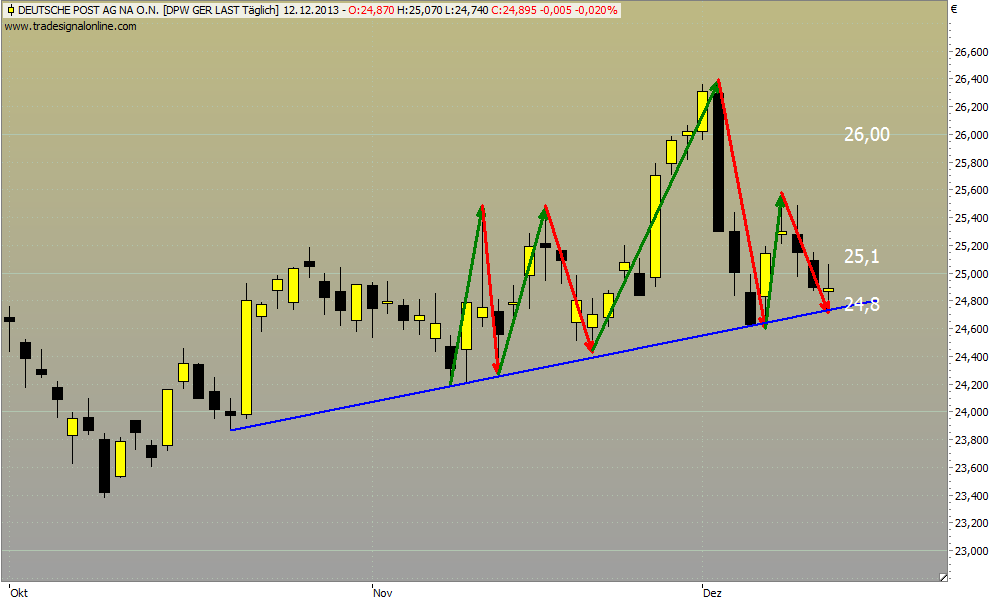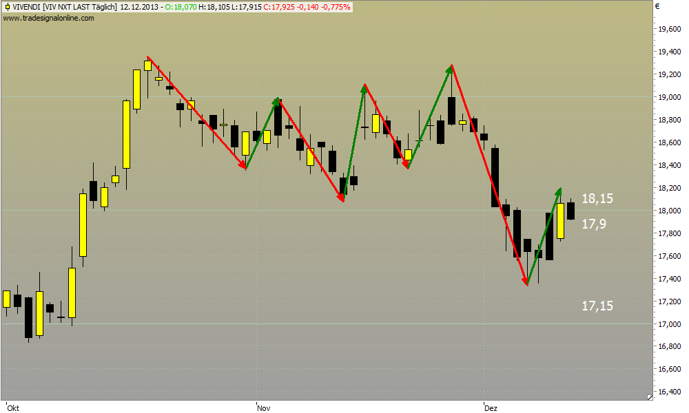 Vivendi nämlich bietet sich für Freitag an, und Dt. Post liefert eine Longmöglichkeit dazu.Der Autor ist in den besprochenen Werten zumeist selbst investiert. Traden auf eigene Gefahr, Signale sind aktuell großteils experimentell zwecks Challenge "In 30 Tagen zur Trading Strategie".