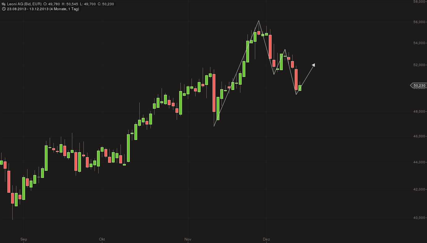 Leoni hingegen kommt formell sogar in Frage. Zwar auch tiefere Tiefs und Hochs, aber immer noch übergeordnet ein Aufwärtstrend erkennbar. Den die beiden Tiefs von Oktober und November liegen noch ein ganzes Stück tiefer.