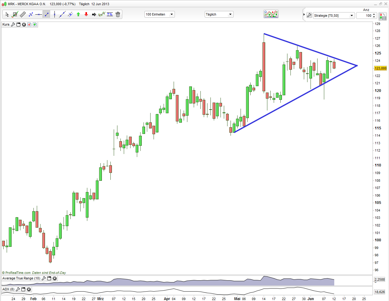 Bei Merck sehe ich so gar keinen Abwärts-Trend. Das Ding dümpelt im Moment doch eher vor sich hin. Wenn ich mir zur Abwechslung mal den Wochenchart anschaue, glaube ich erst recht nicht an einen fallenden Kurs. Und mal in eine ganz andere Schublade gegriffen: Nach Michael Voigts "Markttechnik" hat der Chart sieben Innenstäbe, auch das spricht nicht für Dynamik. Und läuft der Wert nicht in einem Dreieck??? Bin ich zu analytisch und zu pessimistisch?