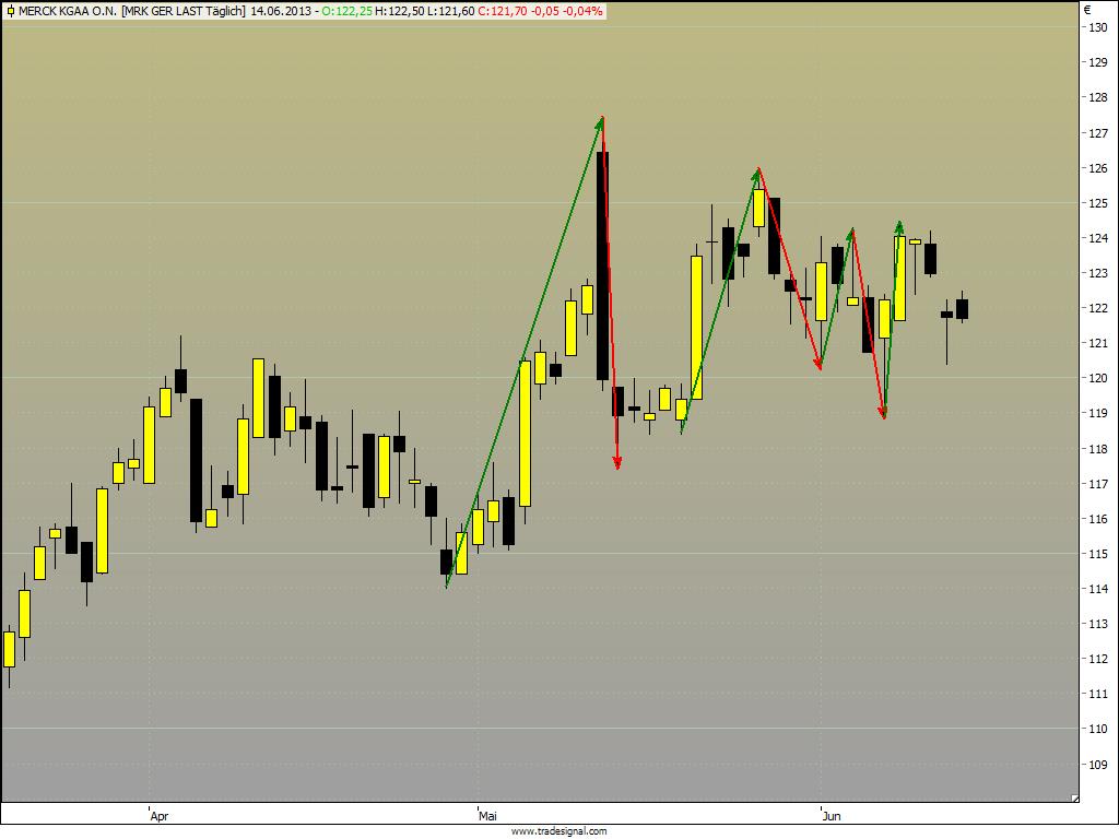 Ich hab den Chart von Merck angehängt wie ich ihn gesehen habe. Natürlich kein ideales Signal gewesen am Mittwoch, aber ein Swing nach unten schien mir doch sehr wahrscheinlich, und der Einstieg günstig.Der Autor ist in den besprochenen Werten zumeist selbst investiert. Traden auf eigene Gefahr, Signale sind aktuell großteils experimentell zwecks Challenge "In 30 Tagen zur Trading Strategie".