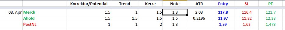 Der Docht, und das betrifft auch den Fragesteller das Posting zuvor, ist in der Tat grenzwertig. So ist das halt mal mit diskretionärem Trading: ich habe 4 Shorts im Depot und keinen Long, und nur Merck hat eine Note besser als 2 meiner Einschätzung nach. Für Korrektur/Potential vergebe ich 1,5. Für den Trend eine glatte 1. Und für die Kerze nur eine 3. Ergibt immer noch 1,8 als Gesamtnote (im Screenshot gestern fehlerhaft, dort stand 1,5 statt 3).