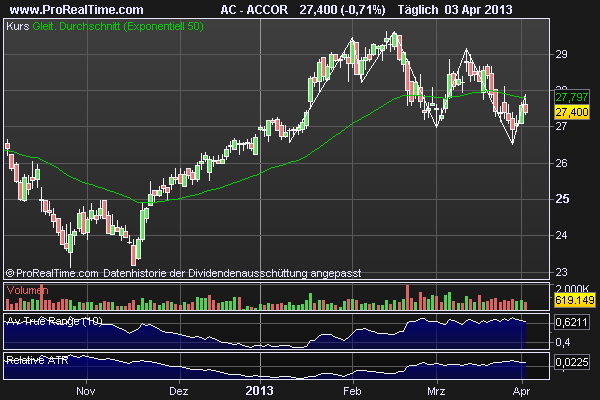 Mir ist jetzt Accor ins Takeprofit gelaufen (Signal vom 03.04.2013: initial risk 100€, d.h. 222 Stücke; Einstieg 27,31€; ATR 0,62€; Spread 0,01€; Stopp 27,69€; Ziel 26,18€), vom Gewinn bleiben nach Transaktionskosten (WHS 15€ round-turn) nur noch 235,-€ übrig. Das würde einem tatsächlichen CRV nach Kosten von nur noch 2,35 entsprechen. Ist das ok, oder hab ich da nen Fehler gemacht, beim Übernehmen deiner Formeln?