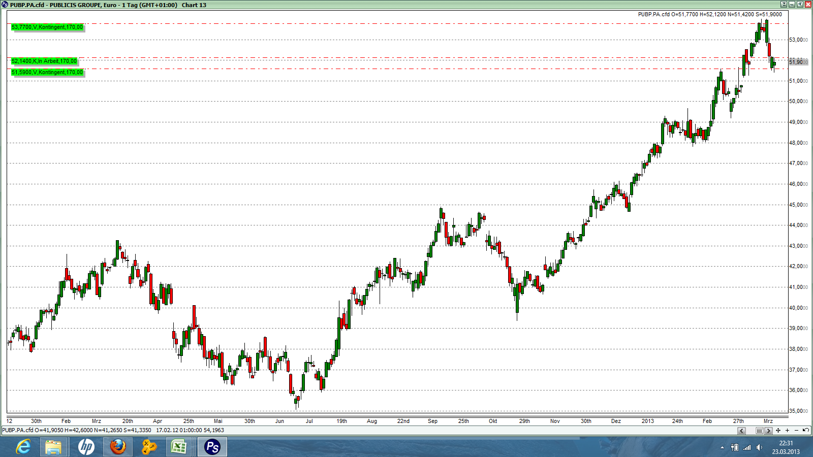 Ich kann mir die Kerzenfarbe bei Publicis aussuchen! Im Demokonto ist die Kerze bullish, im realen Konto bearish. Wie kann das eigentlich sein? Werde ich wohl mal bei WHS nachfragen müssen... Wie kann man bei WHS eigentlich Charts rauskopieren?