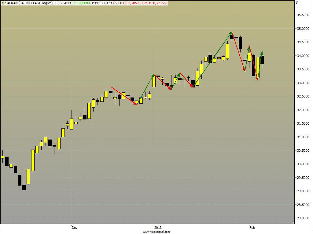 Safran => schlechtes Signal, große Kerze, kein echter Swing, sondern fünf Tage seitwärts. Aber der einzige Short.
