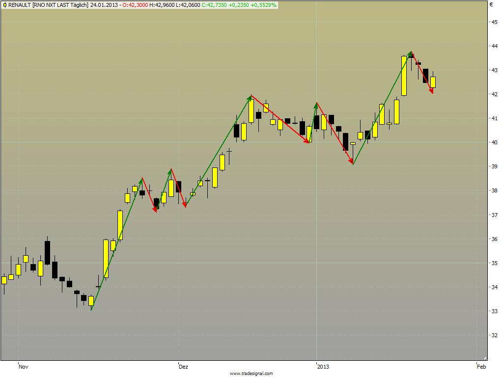 France Telecom und SAP nicht eingestoppt, Renault geht gleich ab wie eine Rakete. Hier sieht man wieder mal, wann die Variante der Stop-Orders richtig einschlägt: beide verpassten Signale wären z.B. mit Limit-Orders prompt in den Stopp gelaufen, während der Winner Renault mit Limit nicht ausgeführt worden wäre.