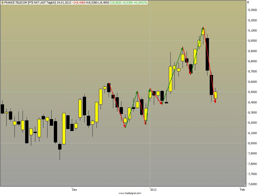 Vielleicht ist mir Frei Schnauze aber auch zu unverständlich. SAP wäre mir mit diesen Riesenkerzen zu unberechenbar, Fresenius SE sieht mir auch nicht wirklich nach einem Short aus. AB Inbev hat wenig korrigiert, Credit Agricole marschiert mir zu sehr seitwärts. Delhaize sieht erst einmal ganz vernünftig aus, aber die großen Kerzen waren sicher newsgetrieben. EDF bewegt sich seit acht Tagen nur seitwärts, France Telecom hat spätestens gestern den Aufwärtstrend gebrochen. Bei Renault ist die Kerze 1 ATR lang und damit sicherlich nicht kurz, das gleiche gilt für STMicroelectronics. Rheinmetall könnte noch eine Option sein, ist aber durch die etwas lange Kerze schon wieder ganz schön gelaufen.