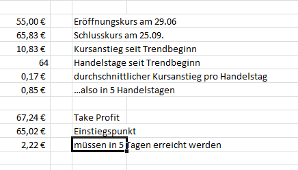 Wenn du jetzt mit 65,02 € einsteigst und das Limit auf 67,24 € setzt (<- das kommt bei mir raus), muss der Kurs aber in 5 Tagen 2,22 € steigen.