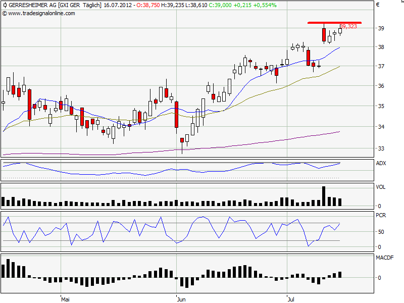 Ich bin für morgen mit schönen zyklischen Handelssignalen nicht fündig geworden. Ich werde mich für morgen etwas aggressiver in den Markt begeben und wähle Bilfinger Berger und Gerresheimer. Bei Bilfinger spekuliere ich auf das Tripletop in Kombination mit dem bearischen Hammer. Bei Gerresheimer finde ich die Kombination aus Doppeltop, vorangegangenem Gap mit hohem Volumen und anschließendem deutlichem Tagesverlust ganz interessant.