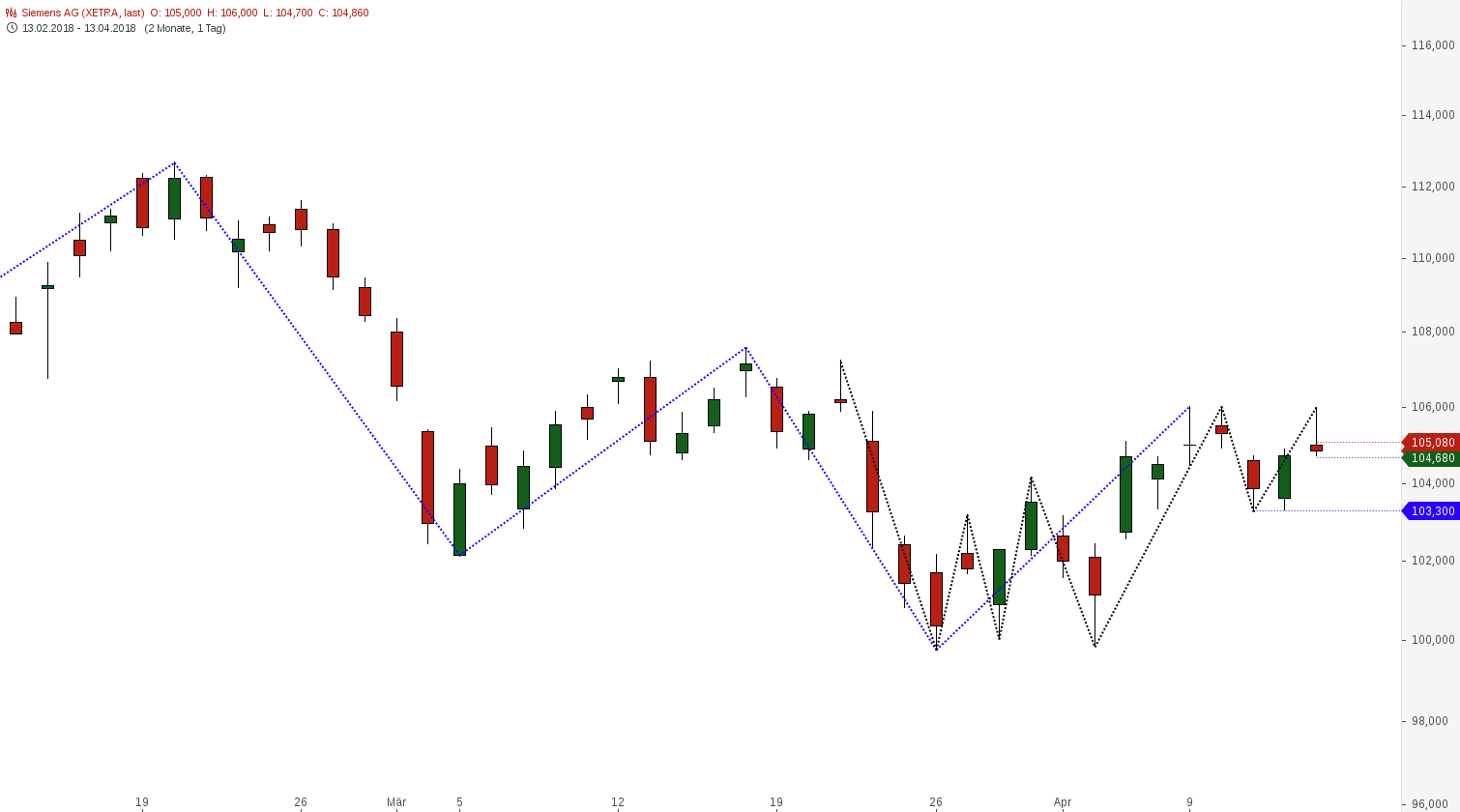 Siemens auch ein Doji, dazu kommt, dass der Tageschart streng formell betrachtet sogar bereits wieder im Lager der Bullen angelangt ist. Höhere Hochs und Tiefs. Was man zurückstellen könnte, wenn der Rest klar überzeugt. Das tut mich diese Form der Tageskerze aber nicht.