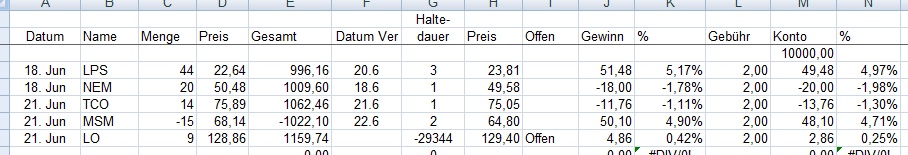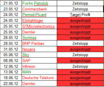 im Anhang habe ich meine letzten 15 Trades genannt. Diese waren alle FS-regelkonform (Einstieg, SL und Target Profit und Zeitstopp am 5. Tag EOD, 1% Risiko) und größtenteils auch Deine Kandidaten aus dem Forum (Ausnahme der letzte, Daimler, hier war ich am Tagestief von letztem Donnerstag short gegangen, obwohl das bereits ein paar Cent tiefer war als das des Vortags). Bis auf den 25.5. bin ich auch nur einen Trade pro Tag in eine Richtung eingegangen.