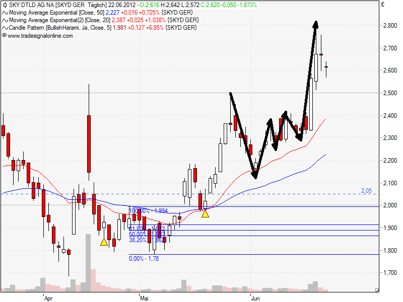 Meine Schwierigkeiten liegen im Verständnis der Kurskorrekturen. Bei Sky haben wir schon einen längeren Upswing hinter uns und die Kurse haben korrigiert und eine bullische Tageskerze gebildet. Hier würde ich Long einsteigen, da die Aktie momentan im Aufwärtstrend ist.