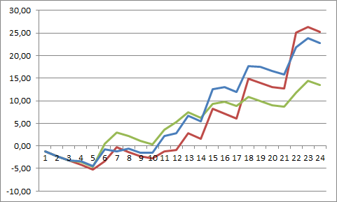 November und Dezember sind auch endlich ausgewertet. Ergibt in 3,5 Monaten gerade mal 24 Trades die den Regeln aus "In 30 Tagen..." entsprechen. Das grüne IST-Ergebnis ist mit +13,5R vor Kosten nicht übel. Positiv überrascht bin ich aber von den alternativ ausgewerteten Exitvarianten. Und zwar dem blauen Trailing Stop der auf dem 1h-Chart basiert OHNE Kursziel. Und sogar ein TS basierend auf dem Daily-Chart, ebenfalls wieder ohne Kursziel, brachte ein noch besseres Ergebnis mit sogar +25,3 R. Was +1,05 R pro Trade entspricht. (Die jüngste Woche ist noch nicht dabei, ich brauche eine längere Historie um die alternativen Stopps auswerten zu können)