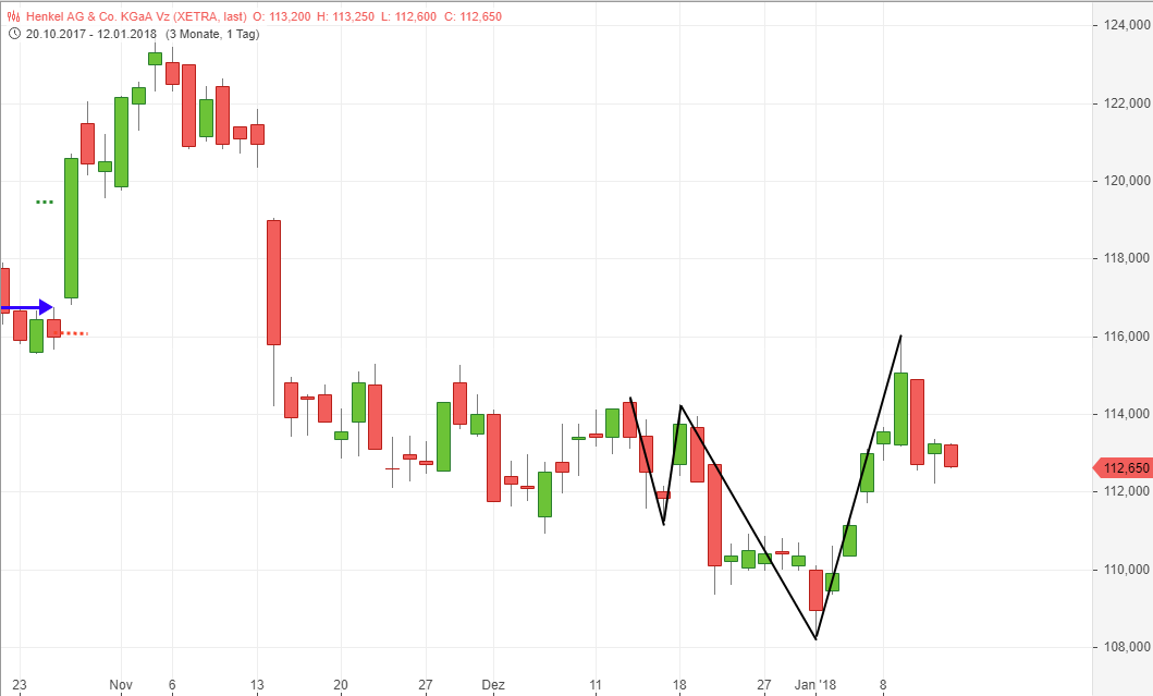 Warum Henkel? Meine Interpretation: Aufwärtstrend im Tageschart, Einstieg nach Konsolidierung, Wetten auf weiteren Aufwärtstrend?