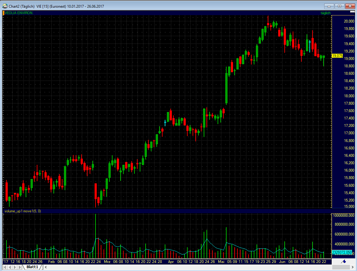 Dazu nehme ich noch Veolia, weil das bei diesem engen Kursziel ein High Probability-Trade ist mit 19,12 + 18,93 + 19,7 = 3er CRV.