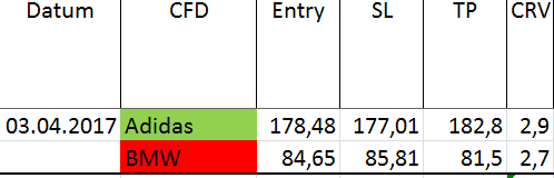 Der Freitag war noch ein versöhnlicher März-Ausklang mit zwei Kurszielen: SAP und Dt. Post mit in Summe +4,3R. Peugeot mit +0,7 R erfolgreich in Short gedreht, machte dann +5R. Bayer davon wieder ein Stück weggeknabbert mit -1R.