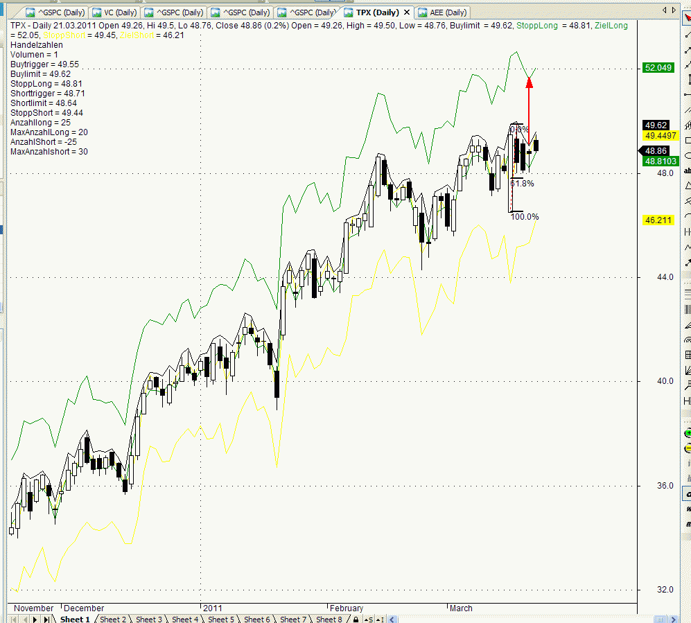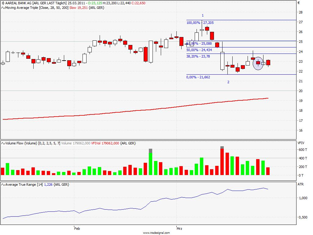 wenn ich es richtig verstehe, dann ist in meiner Abbildung Nummer 1 das Hoch und Nummer 2 das Tief, sonst werden die 61,8 % nicht erreicht. Somit könnte man den 23.03.2011als Rücksetzer und Einstiegstrigger werden. Nun meine Frage: Ist es nach dem vorherigen, starken Kursrückgang nicht eher als Rauschen, denn als Swinghoch und Swingtief zu betrachten und sind wir nicht noch im Shortmodus?