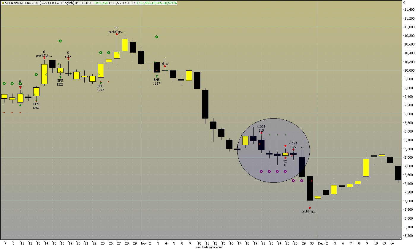 Ein aktuelles Beispiel habe ich gerade im Backtesting für Solarworld vorliegen am 25.11.2010. Sind im Short, Zeitstopp greift, gleichzeitig neues Signal. Im Backtest sind das nun 2 verschiedene Trades, in der Realität kann man ja gleich im Short bleiben und erspart sich so die Transaktionskosten.