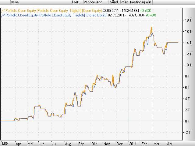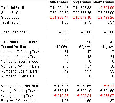 Das Ergebnis zeigt wieder einmal eindrucksvoll, dass man bei den meisten Strategien nicht zu viel geben braucht auf die sogenannten Leitindizes (vergleiche mit Forumstests.1 ). Jede Aktie hat ihr Eigenleben, und in unserem Fall spielt ja zwischen Close USA und Open EU noch Asien eine Rolle.