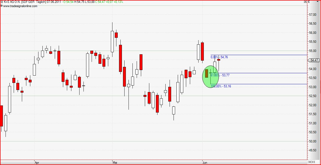 @hattorihanzo: Wegen K+S: Klar müssen auch hier die Fibos nachgezogen werden, aber wir hatten doch keinen Trendwechsel. Daher dachte ich, dass der Doji ein bullisches Signal sei. Aber vielleicht kann uns Hintman hier weiterhelfen. Er hat so etwas schön öfter gesehen.
