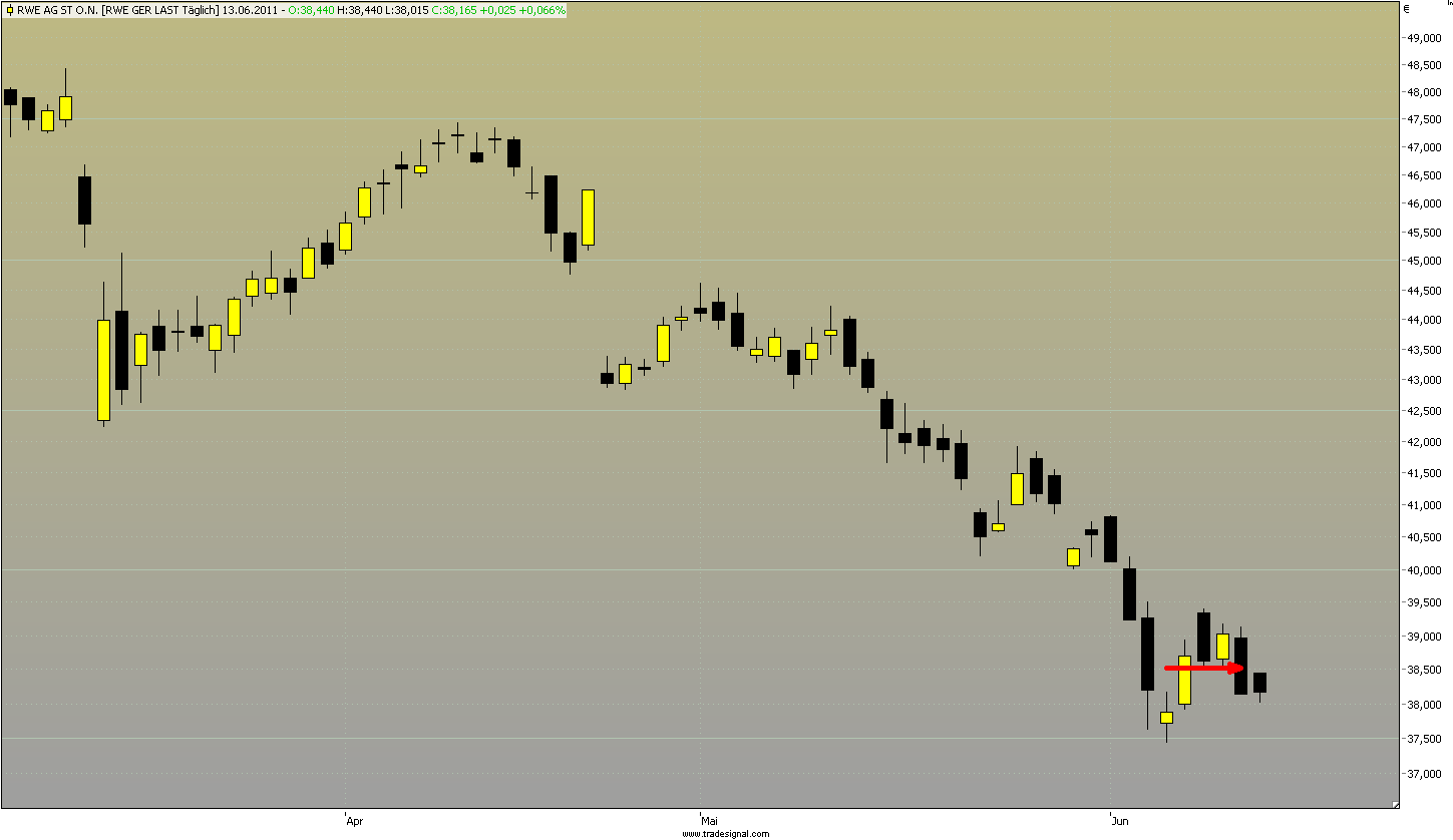 Und RWE produzierte sein Shortsignal doch bereits am 9.6., wer will denn da noch hinterher springen bei einem neuen Zwischentief heute?