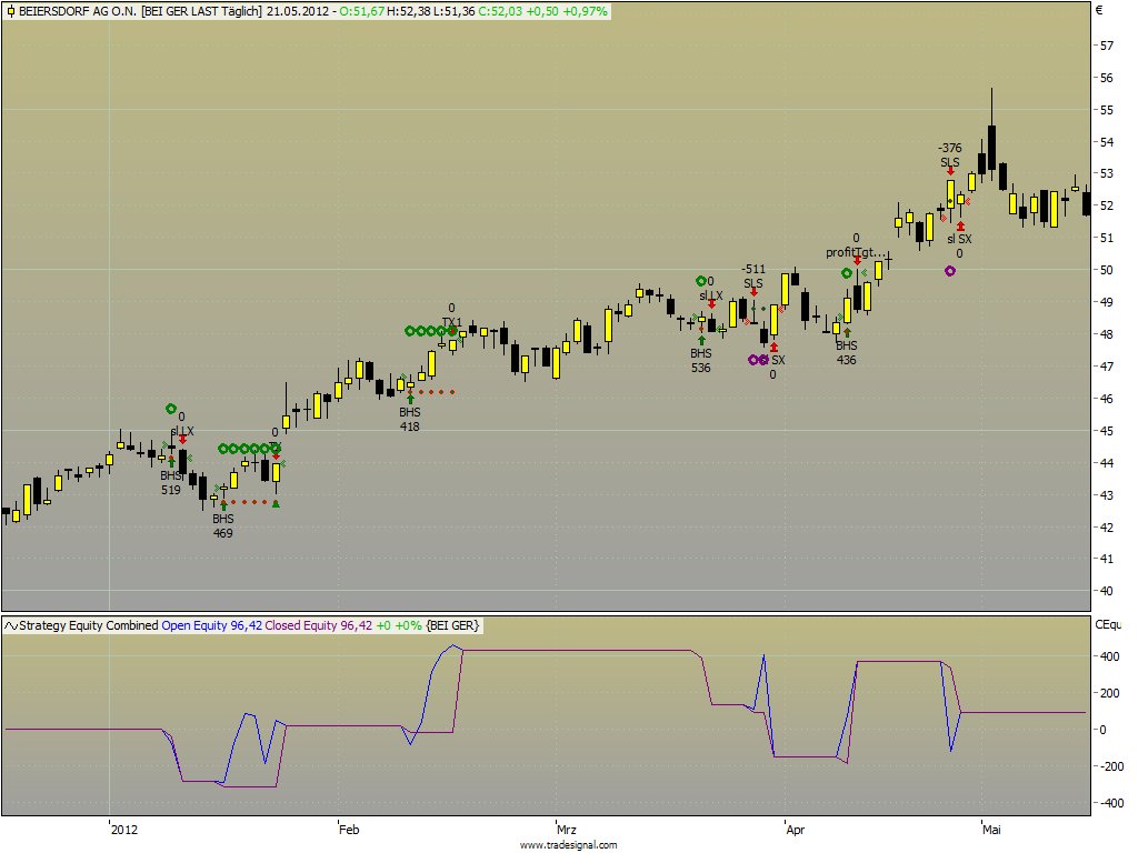 Beiersdorf hingegen liegt mir absolut nicht, da komme ich einfach auf keinen Profit Faktor >2. Und das ist meine Minimalbedingung, um mit einer Aktie weiter zu arbeiten, im Anhang nur mal die Signale von 2012.