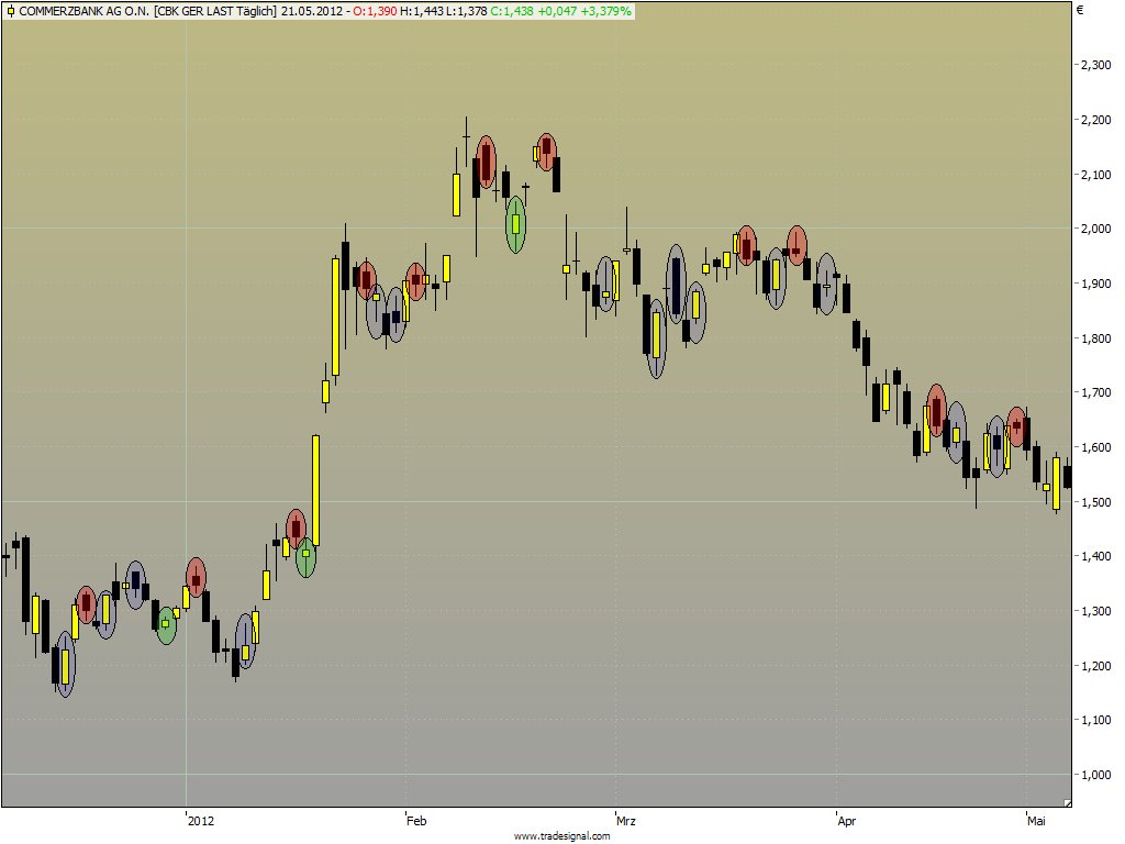 Blau markiert nun wieder bei Commerzbank jene Situationen, die eben nicht für einen Einstieg in Frage kamen.